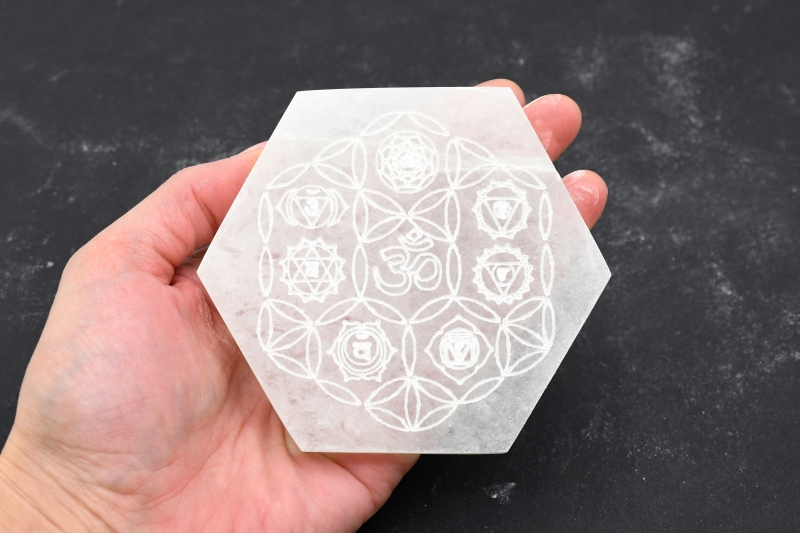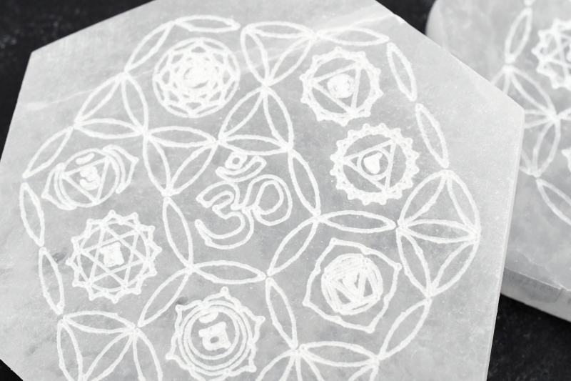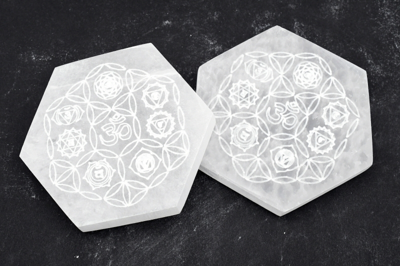 Selenit Untersetzer sechseckig "Chakra & Om"