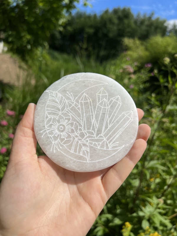 Selenit Untersetzer "Zodiac" Größe : ca. 100 mm Herkunft : Marokko Preis pro Stück