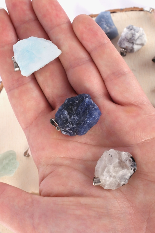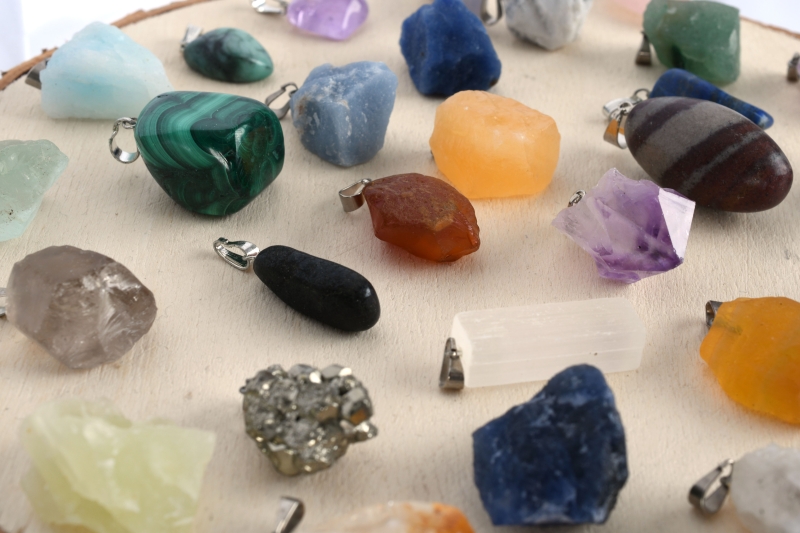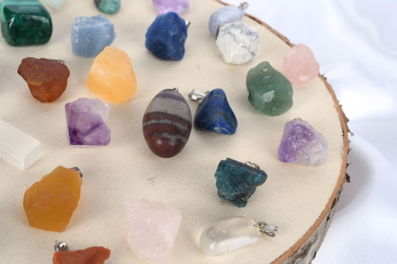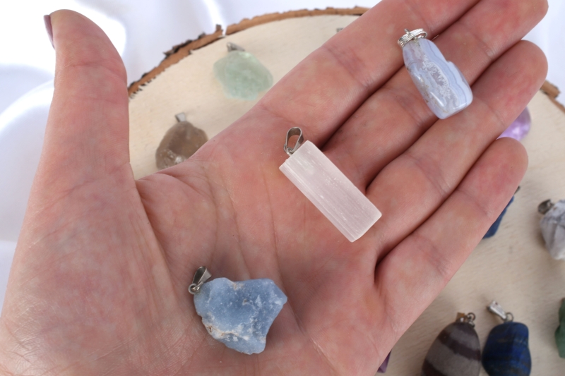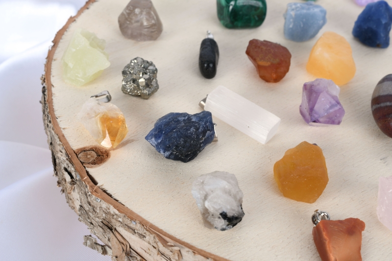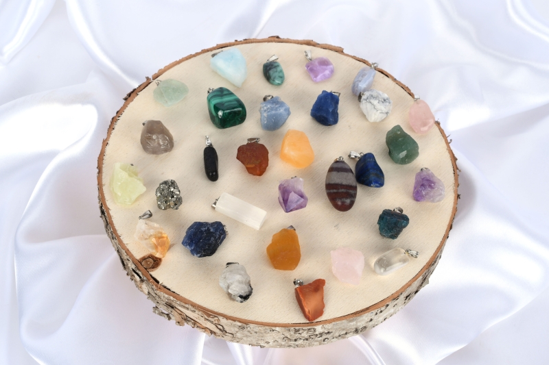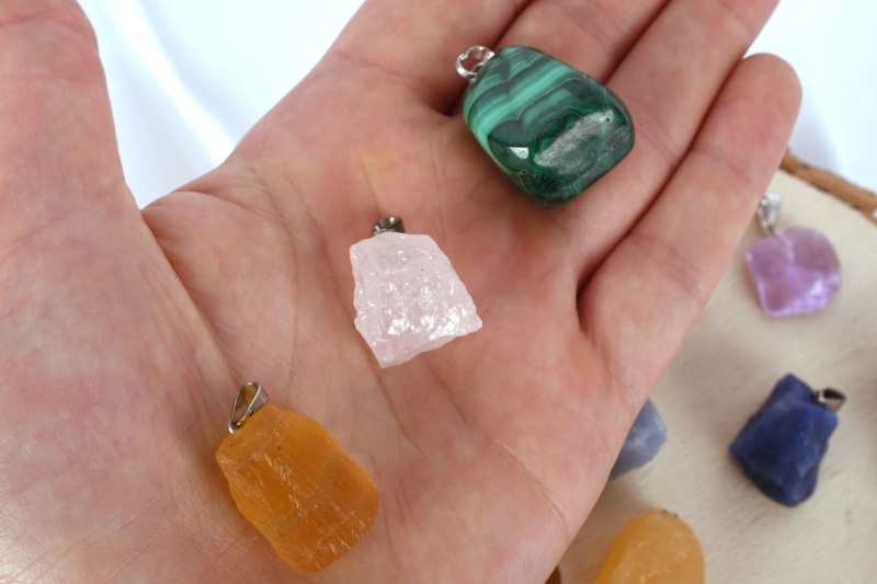 Sorten: Amethyst, Gebrannter Amethyst (Citrin), Aquamarin, Fluorit gelb, Fluorit grün, Selenit, Turmalin, Pyrit, Shiva Lingam, Rosenquarz, Lapis Lazuli, Blue Lace Chalcedon, Smaragd, Malachit, Calcit orange, Rauchquarz, Serpentin, Honig Calcit, Blau Quarz, Bergkristall, Angelit, Howlit, Mondstein weiß, Aventurin, Sodalith, Tigerauge, Carneol, Hematit, Regenbogen Fluorit, Feuer Achat.